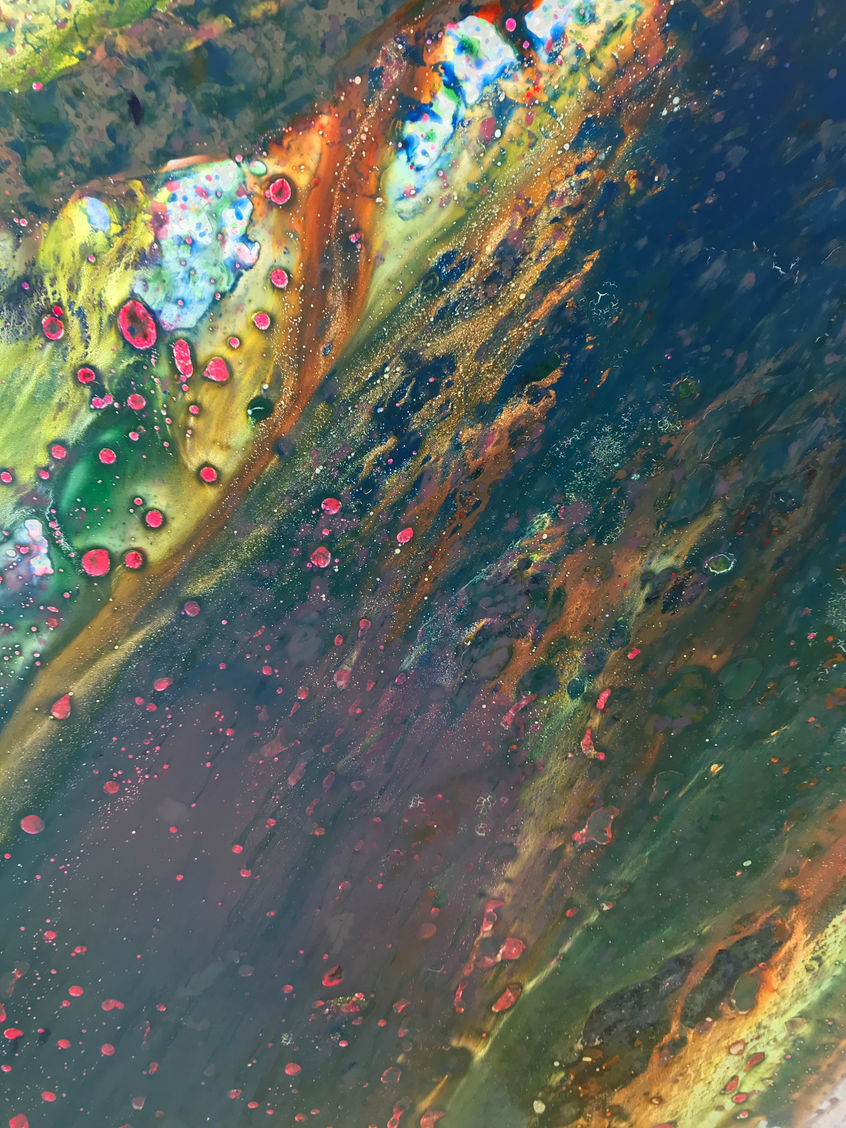 Acrylic, Water colour, Oil paint, Linseed oil, Water, and Bubble mixture on Glass